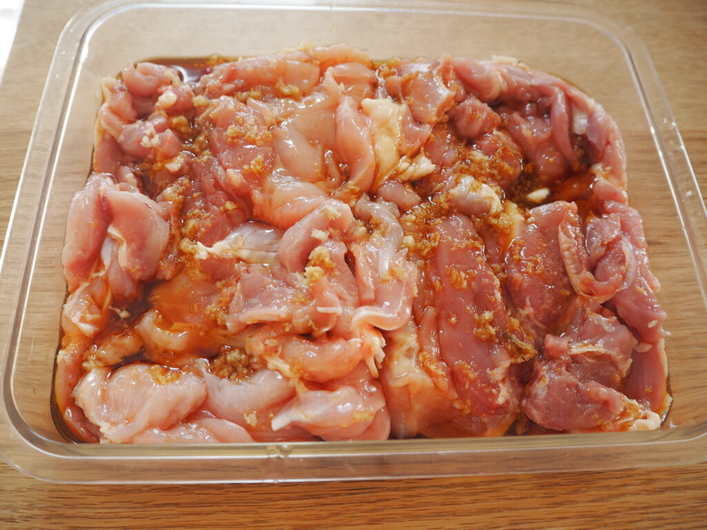 鶏もも肉は余分な脂を除き、均一な厚さに切り広げます。鶏もも肉1枚に対し、おろしにんにく、おろし生姜を各小さじ1、醤油、酒、みりん各大さじ1を合わせた漬け汁に30分ほど漬け込みます(写真は鶏もも肉2枚分です)。
