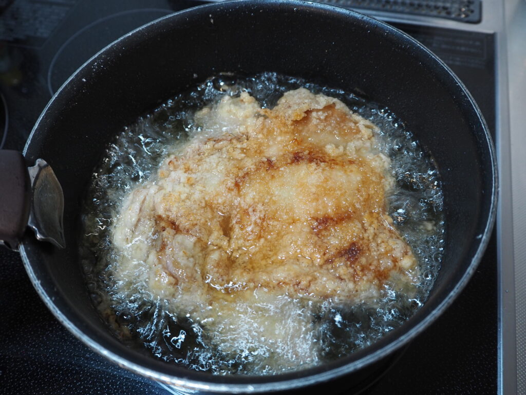 170度ほどの油で表裏返しながらこんがりと揚げます。下味を付けてある分少し焦げますが、それも含めて美味しいので良しとします。