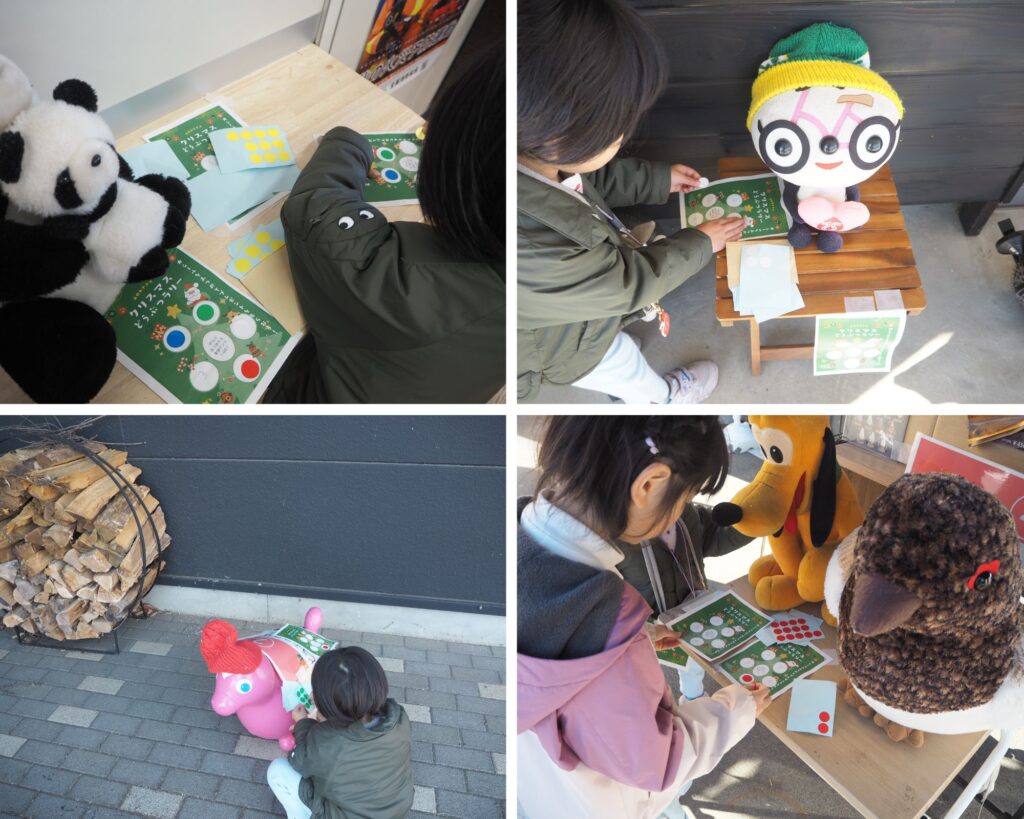 まず受付で「冬の動物さがしラリー」の台紙をもらいました。みのわテラス内に5か所あるポイントを探し、シールを貼ってまわります。動物のぬいぐるみが目印になっていて、子どもたちは楽しみながら探していました。