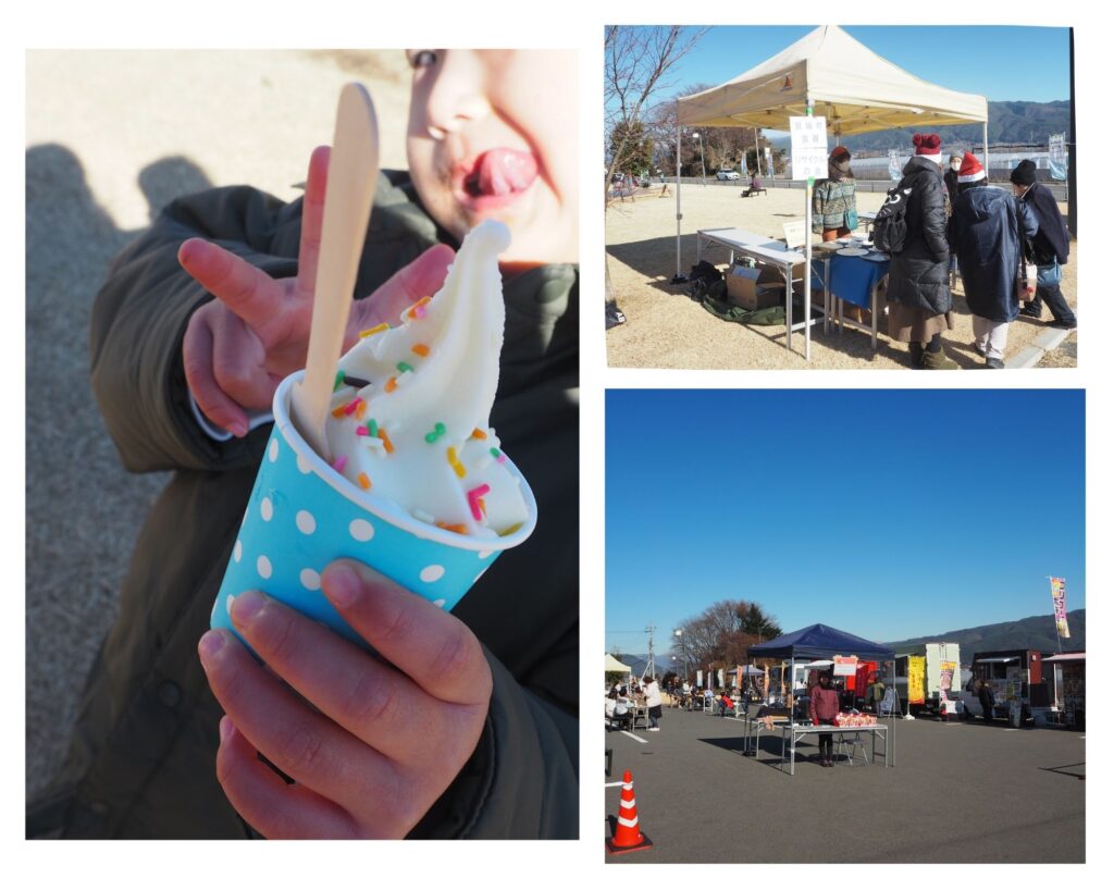 たくさんのキッチンカーや飲食店が出店しており、何を食べようか迷ってしまうほど。娘はお気に入りの「テラスすたんど」のソフトクリームをチョイス。12月限定ホワイトチョコフレーバーに舌鼓を打っていました。子ども用ミニサイズが選べるので、小さいお子さんも食べやすいですよ。
