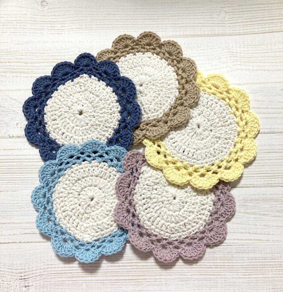 今回はコットン100%の糸と、コットンとポリエステルの混紡の糸を使って、喫茶店風のコースターを作ってみました。