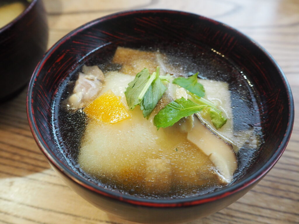 出汁は干し椎茸。醤油で味付けをしたすまし汁には、ごぼうや人参などの根菜、油揚げや鶏肉などが入っていて、味わい深く仕上がっています。私にとって定番の味。