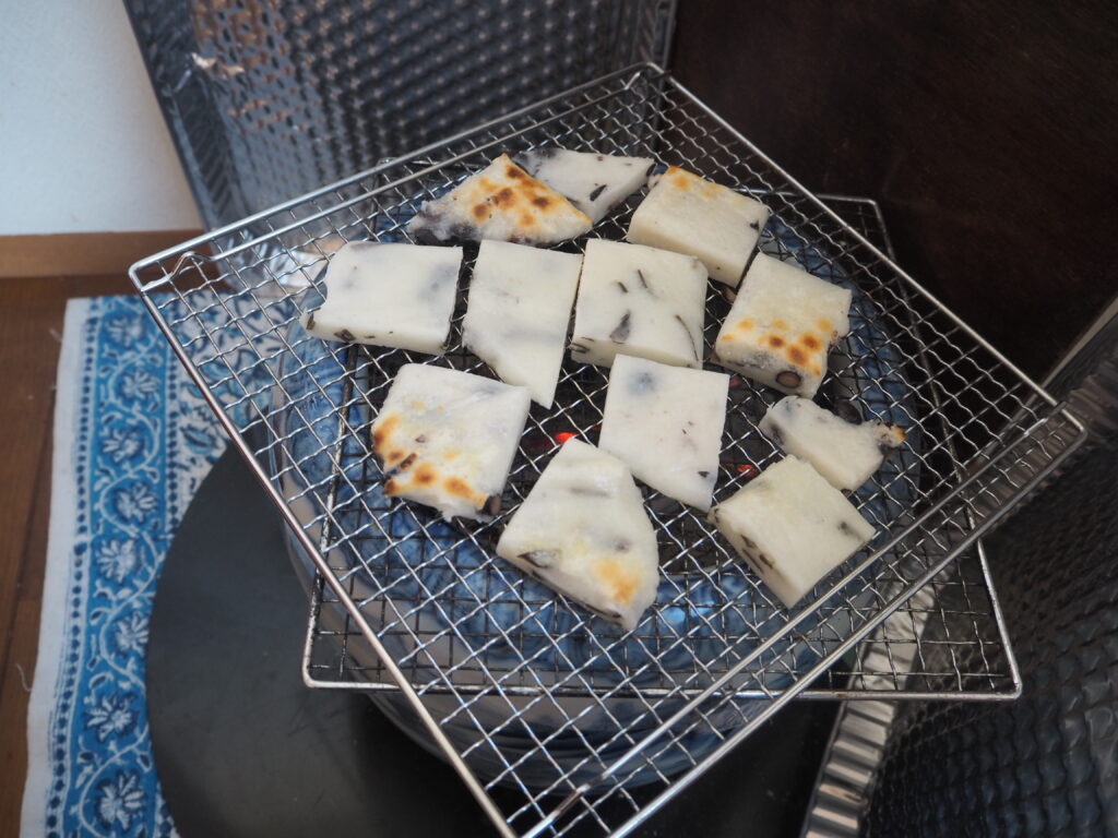 お餅は両親が育てたもち米から作った自家製の角餅で、火鉢で香ばしく焼きます。