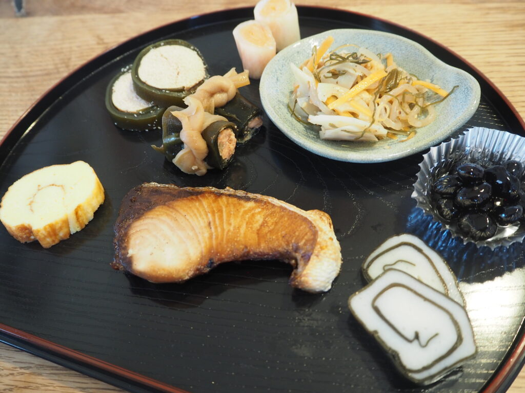 定番の黒豆、伊達巻、昆布巻き、なますなどが並びます。富山県の定番、昆布で巻いたかまぼこは子供たちの大好物。お土産にもおすすめの一品です。昆布料理多めのラインナップとなっており、そこが富山県らしさでしょうか。