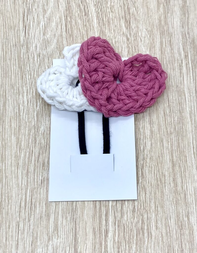 ヘアゴムは市販のものを使用しますので、編むのはモチーフの大きいハートと小さいハートだけです。編み物に慣れている方であれば30分くらいで完成すると思います。