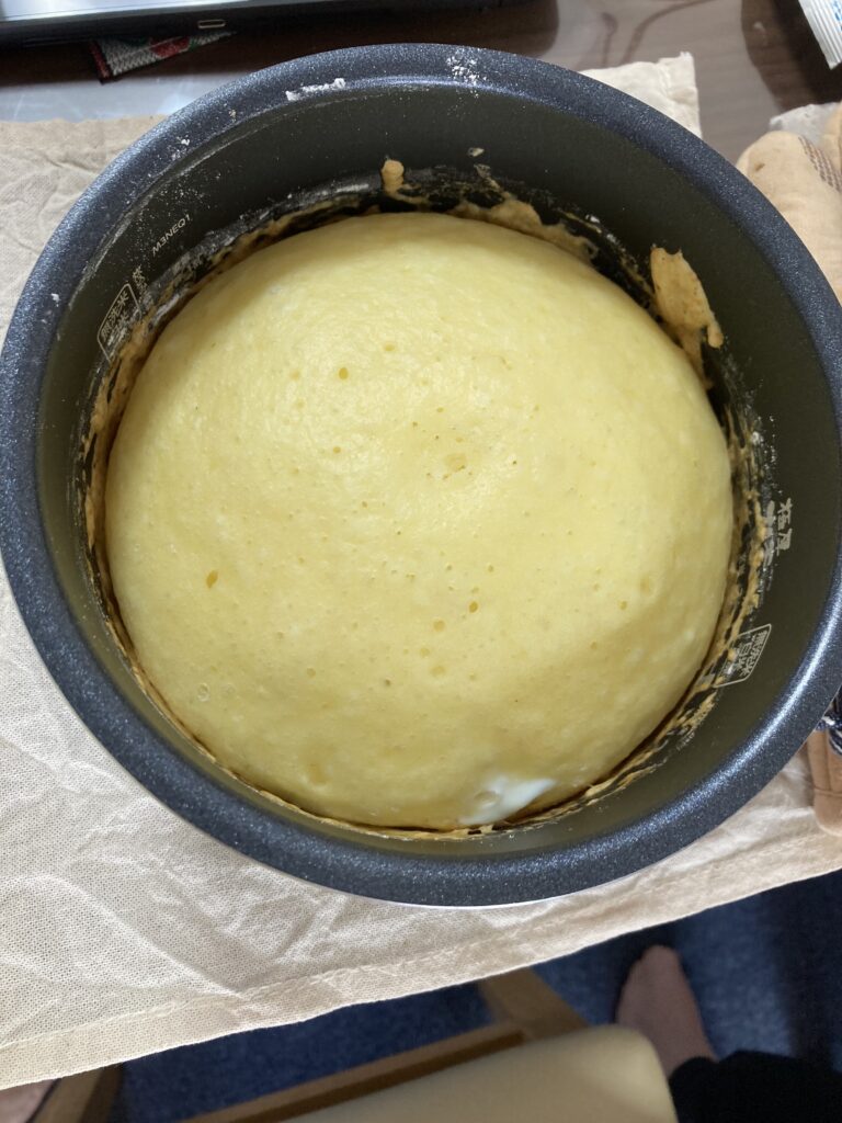 その後炊飯窯に生地を移して炊飯します。蒸しパンを作れるモードがある方はそれを使用してください。それ以外の方はケーキモードを使用してください。