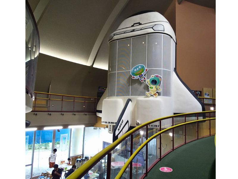 移動するだけでも、探検しているようで子供たちはワクワクしていましたが、スロープの途中には宇宙船の模型の展示も。