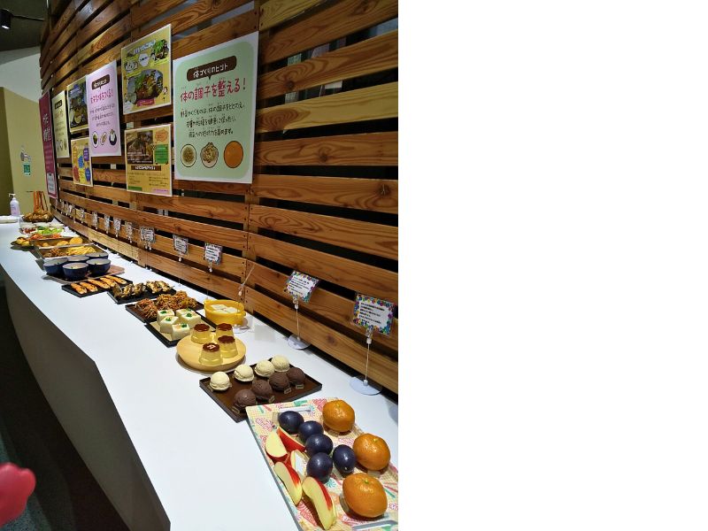 人体迷路の隣には、本物そっくりのおかずがならんだバイキングスペースのような場所があります。